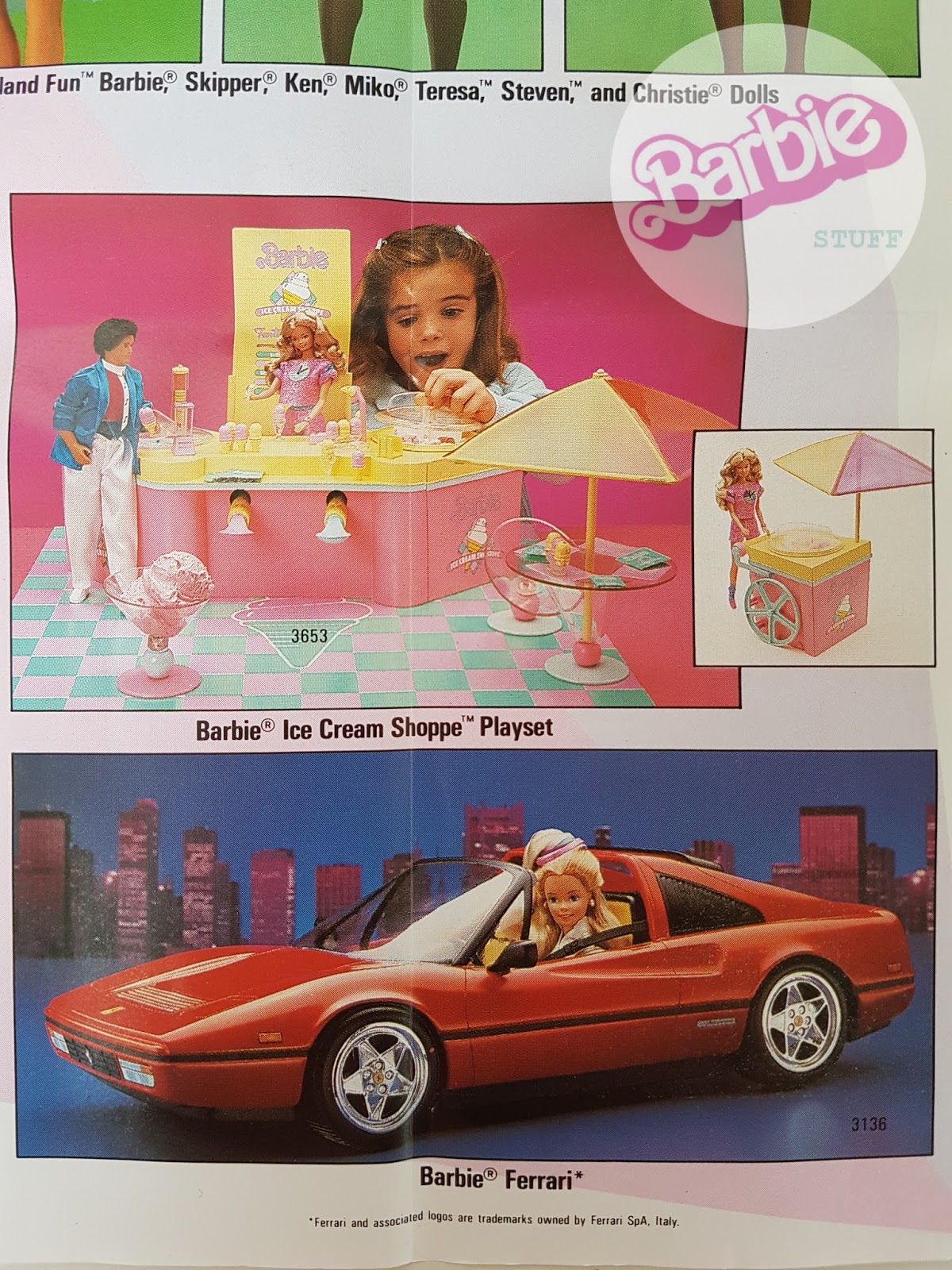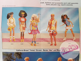 Barbie World of Fashion, czyli przepustka do ukrytego na małych ilustracjach świata sztandarowego produktu firmy Mattel lat osiemdziesiątych. Świata pełnego słodkich buziek Superstar, tiulowych sukienek, kokard, bufiastych rękawów, wielkich fryzur i różowych akcesoriów. Miniaturowy katalog stanowił dodatek do lalek sprzedawanych w roku 1988 i przedstawiał ich serie wypuszczone w tym okresie. Na zdjęciach możemy, więc zobaczyć cały wypust Perfume Pretty, czyli Barbie, Whitney i Kena wraz z zestawami ubranek, biżuterii oraz akcesoriów dla małych klientek Mattela. Poniżej możemy podziwiać także piątkę przyjaciół z Kalifornijskiego Snu wyposażonych w dodatkowe stroje i playsety oraz wyspiarzy z serii Island Fun. W folderze swoje pięć minut miała Teen Fun Skipper oraz po raz kolejny zaprezentowano w nim czerwone ferrari z Super Hair Barbie za kierownicą. Rok 1988 to również moment pojawienia się na rynku ostatniego wypustu serii Rockersów, czyli The Sensations, w ramach którego wyprodukowano cztery lalki, kilka zestawów ubranek i sklep muzyczny z różową szafą grającą. Na poniższych zdjęciach możemy zobaczyć także kolejną przedstawicielkę My First Barbie - blondwłosą balerinę oraz przyjrzeć się bliżej walizce z mini szpitalem (Doctor Barbie Loving Care Playcase). World of Fashion 1988 to już kolejny katalog, który trafił do mnie przy okazji zakupu lalek przez Internet. Pierwszym był "Świat Mody" Barbie z 1987 roku, a drugim reprodukcja folderu z początku lat siedemdziesiątych. Analizowanie każdego z nich sprawiło mi taką samą radość i... rozbudziło apetyt na następne lalki, więc oglądacie na własną odpowiedzialność!